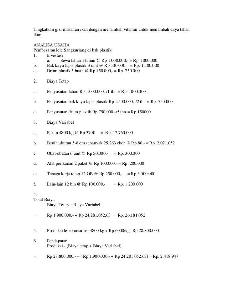 Analisa Usaha Pembenihan Ikan Lele Rencana Nilai Jual Modal